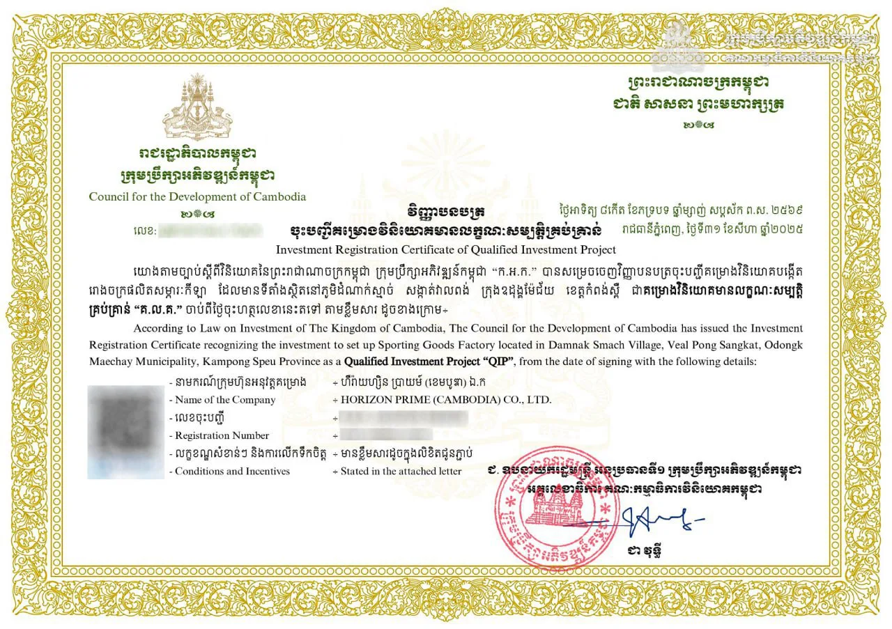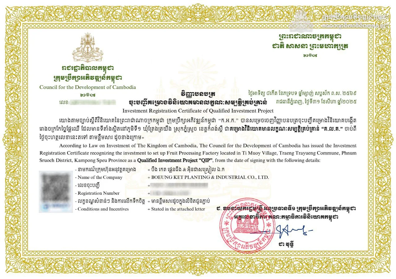 The Cambodian government, through the Council for the Development of Cambodia (CDC), has issued registration certificates for two investment projects as qualified investment projects in Kampong Speu Province.