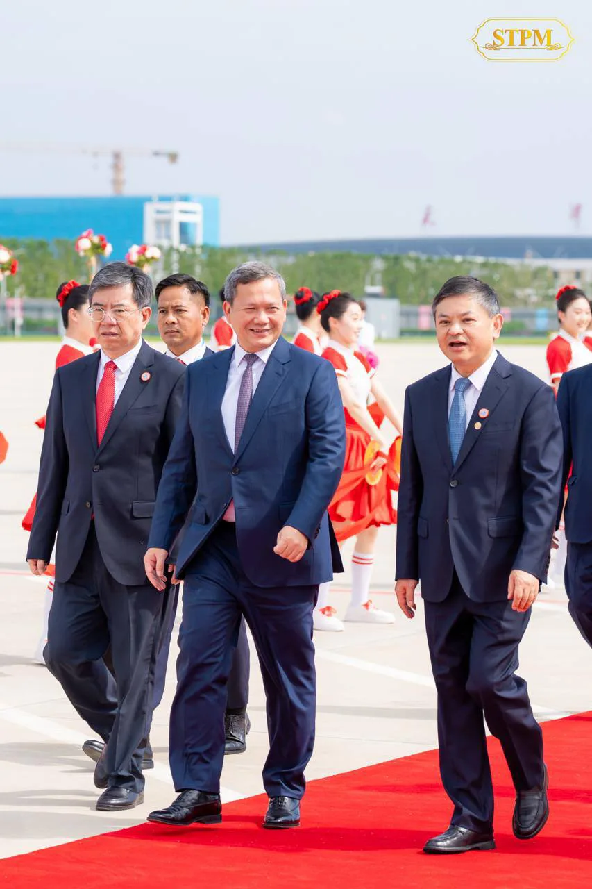 សម្តេចធិបតី ហ៊ុន ម៉ាណែត នាយករដ្ឋមន្ត្រីកម្ពុជា អញ្ជើញដឹកនាំគណៈប្រតិភូរាជរដ្ឋាភិបាលកម្ពុជា បានទៅដល់អាកាសយានដ្ឋានអន្តរជាតិ Tianjin Binhai នៅទីក្រុងធានជីន ព្រមទាំងបានការទទួលស្វាគមន៍ពីសំណាក់ ឯកឧត្តម HUANG Runqiu រដ្ឋមន្រ្តីក្រសួងអេកូឡូស៊ី និងបរិស្ថាន នៃសាធារណរដ្ឋប្រជាមានិតចិន នារសៀលថ្ងៃទី៣០ ខែសីហា ឆ្នាំ២០២៥។
