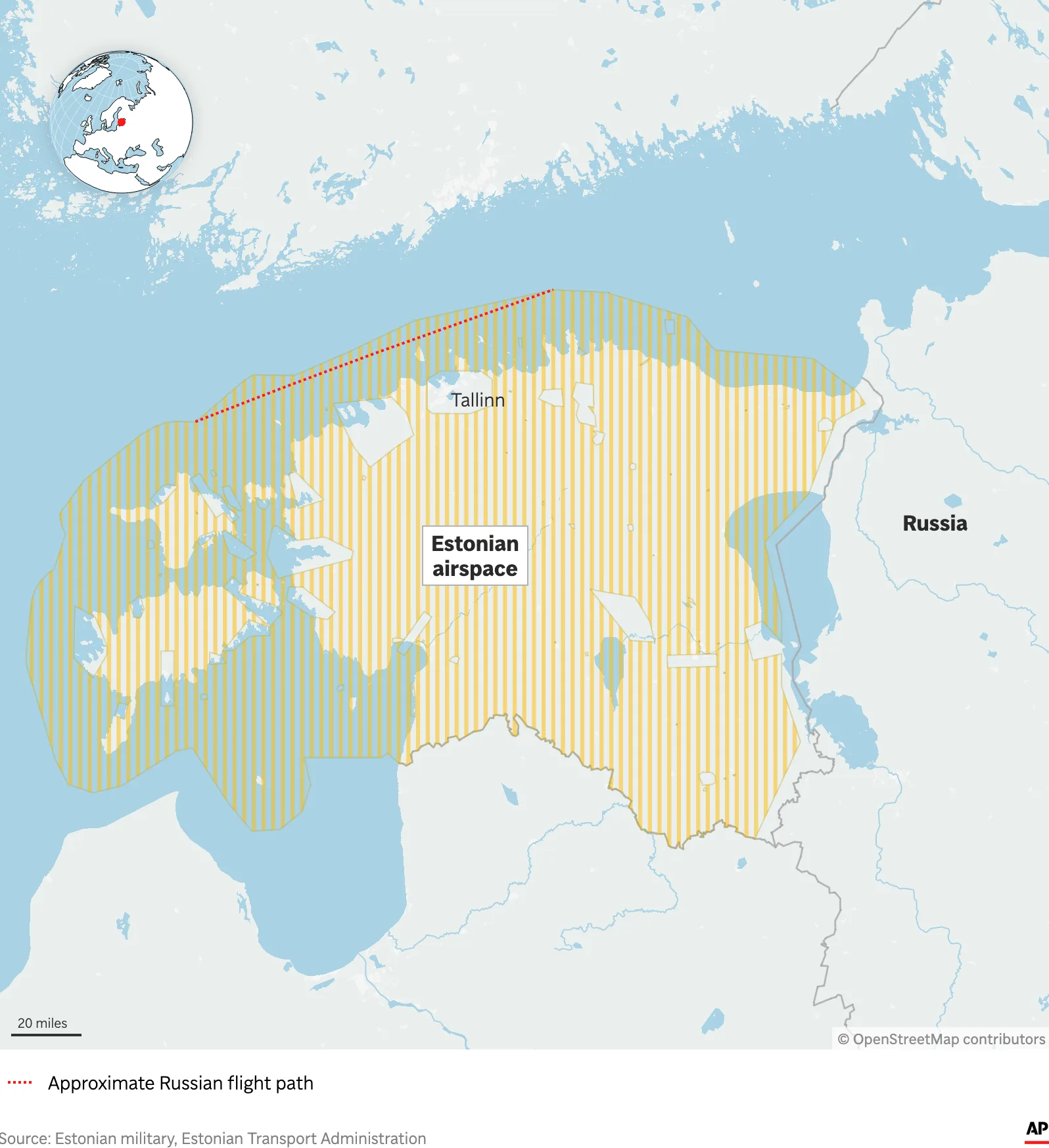 Margus Tsahkna, Estonia’s foreign minister, told AP the incident was “a very serious violation of NATO airspace.” The last time Estonian airspace was violated for so long was in 2003, he said, “just before Estonia joined NATO.”